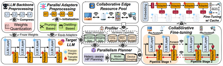 Large language models (LLMs) have unlocked a plethora of powerful applications at the network edge, such as intelligent personal assistants. Data privacy and security concerns have prompted a shift towards edge-based fine-tuning of personal LLMs, away from cloud reliance. However, this raises issues of computational intensity and resource scarcity, hindering training efficiency and feasibility. While current studies investigate parameter-efficient fine-tuning (PEFT) techniques to mitigate resource constraints, our analysis indicates that these techniques are not sufficiently resource-efficient for edge devices. Other studies focus on exploiting the potential of edge devices through resource management optimization, yet are ultimately bottlenecked by the resource wall of individual devices. To tackle these challenges, we propose PAC+, a resource efficient collaborative edge AI framework for in-situ personal LLMs fine-tuning. PAC+ breaks the resource wall of personal LLMs fine-tuning with a sophisticated algorithm-system codesign. (1) Algorithmically, PAC+ implements a personal LLMs fine-tuning technique that is efficient in terms of parameters, time, and memory. It utilizes Parallel Adapters to circumvent the need for a full backward pass through the LLM backbone. Additionally, an activation cache mechanism further streamlining the process by negating the necessity for repeated forward passes across multiple epochs. (2) Systematically, PAC+ leverages edge devices in close proximity, pooling them as a collective resource for in-situ personal LLMs fine-tuning, utilizing a hybrid data and pipeline parallelism to orchestrate distributed training. The use of the activation cache eliminates the need for forward pass through the LLM backbone, enabling exclusive fine-tuning of the Parallel Adapters using data parallelism. Extensive evaluation of the prototype implementation demonstrates that PAC+ significantly outperforms existing collaborative edge training systems, achieving up to a 9.7× end-to-end speedup. Furthermore, compared to mainstream LLM fine-tuning algorithms, PAC+ reduces memory footprint by up to 88.16%.
